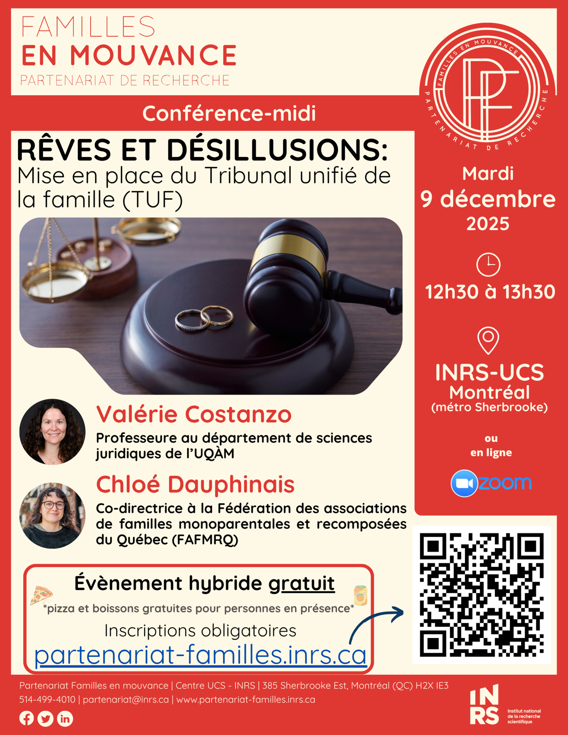 Le 9 décembre prochain, le partenariat de recherche Familles en mouvance accueillera Valérie Costanzo, professeure au Département de sciences juridiques de l’Université du Québec à Montréal, et Chloé Dauphinais, co-directrice à la Fédération des associations de familles monoparentales et recomposées du Québec, pour aborder la récente création du Tribunal unifié de la famille (TUF).